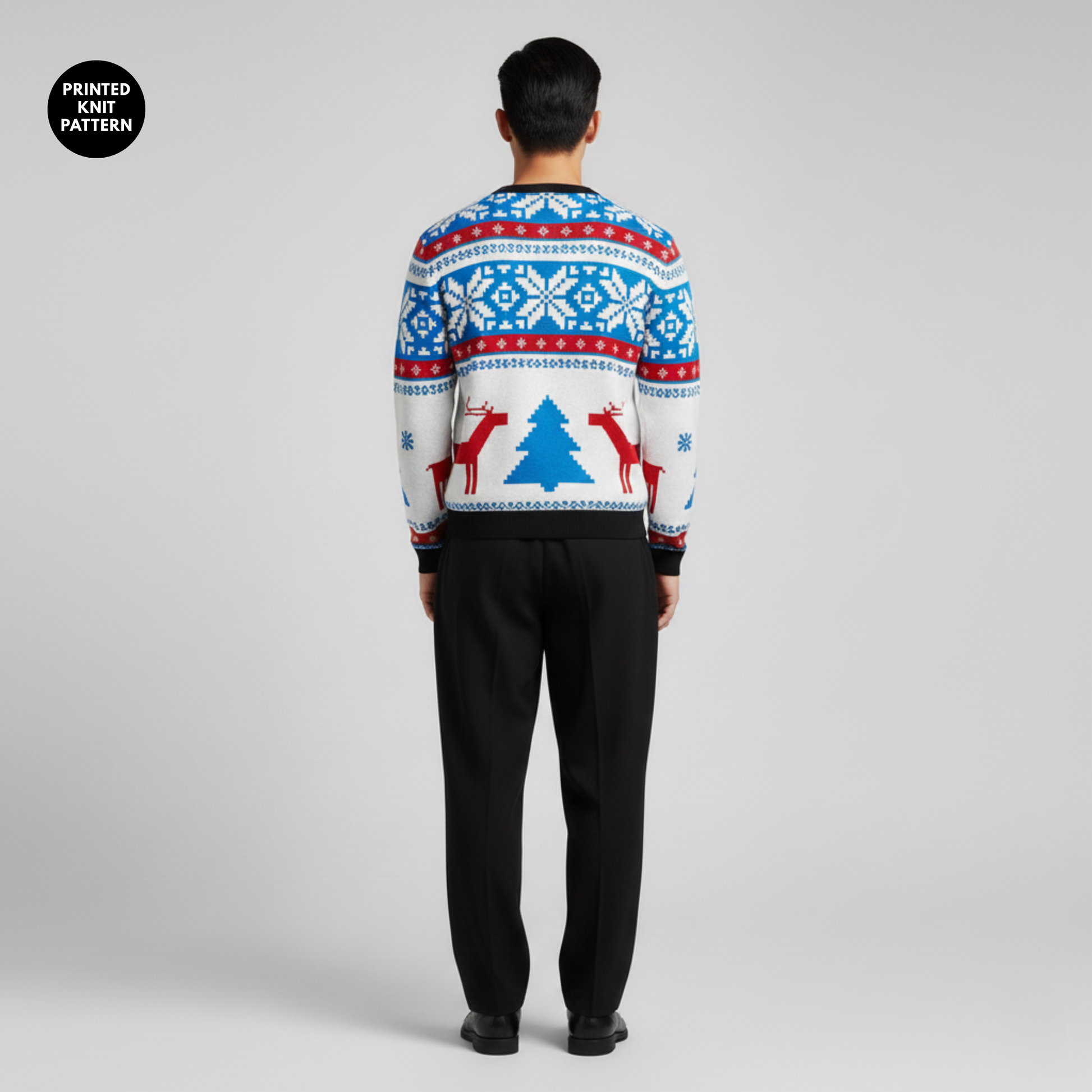 Reindeer, pine trees, and snowflakes organize into clean geometric bands using a striking red, blue, and white palette that channels classic holiday energy with graphic clarity. The structured motif placement and vibrant color interplay deliver strong visual impact suited for celebrations and seasonal outings. (Note: the knit texture is a printed design, not an actual knitted fabric.)