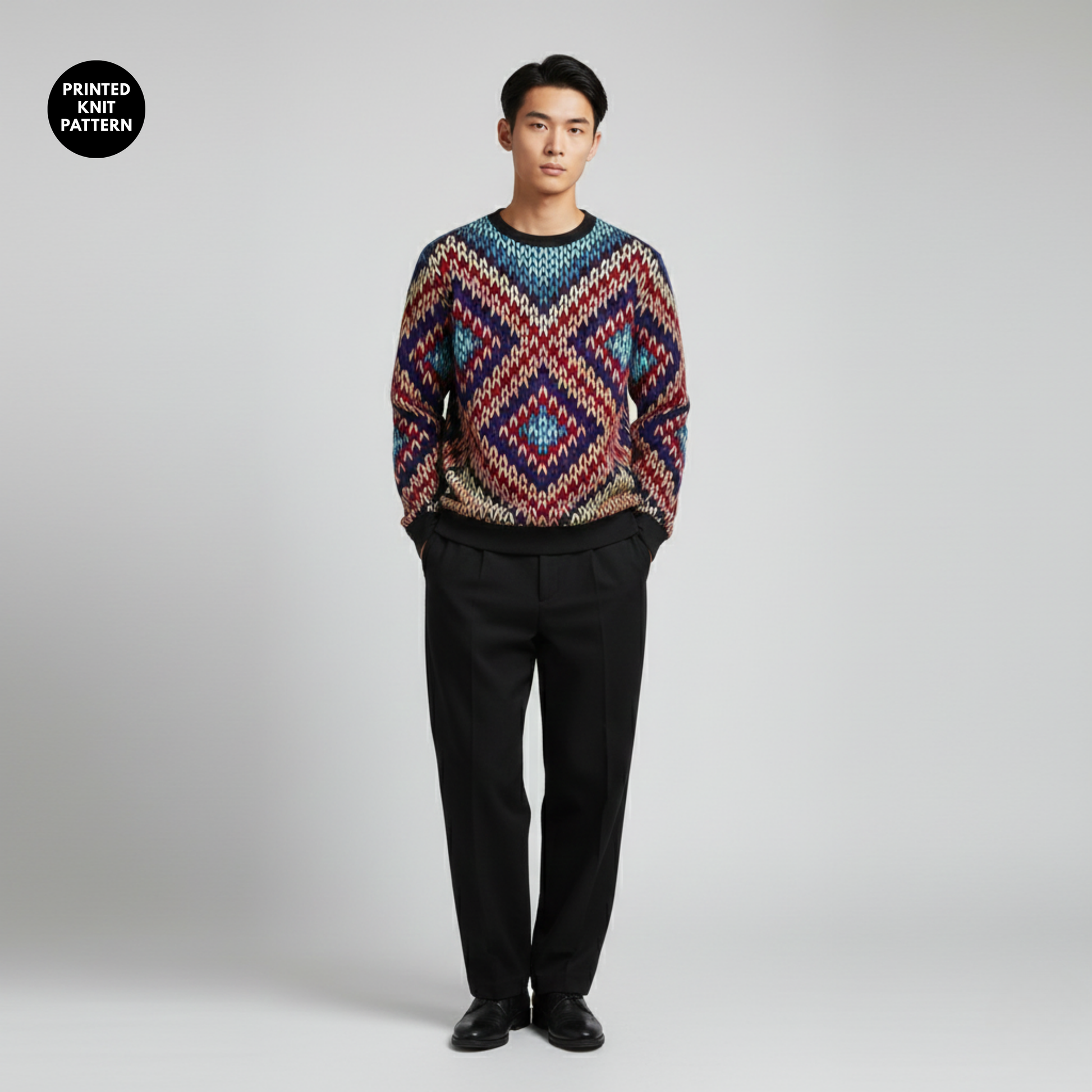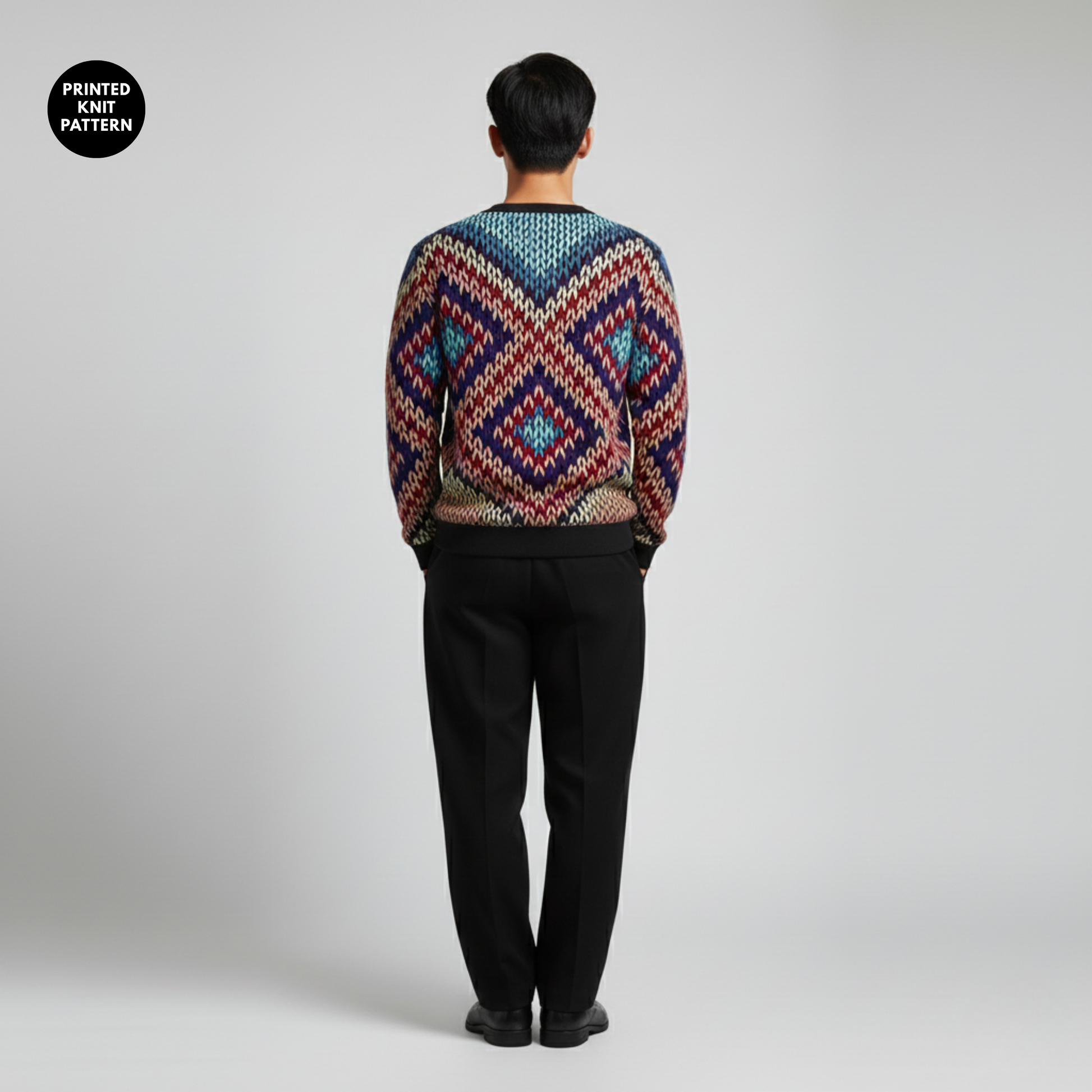 Chevron-inspired patterns weave together in striking tones of blue, maroon, peach, and teal, forming a bold colorful tapestry. The energetic zigzag design and warm color mix create a lively knit-style aesthetic that brightens up any winter day. This graphic statement piece offers a modern, artful approach to seasonal dressing for the spirited wearer. (Note: the knit texture is a printed design, not an actual knitted fabric.)