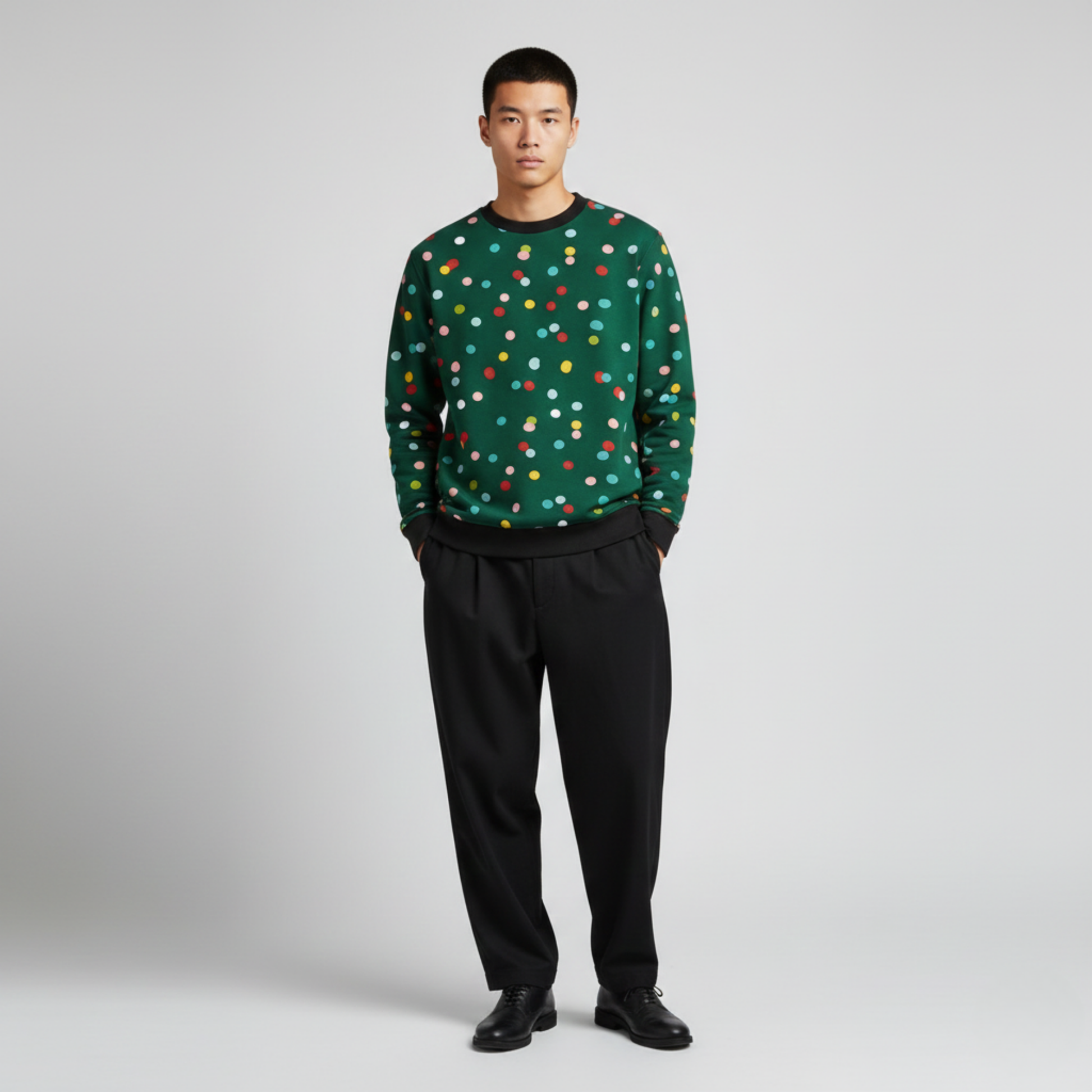 Multicolor dot prints disperse across a rich green backdrop, forming a spontaneous all-over graphic with upbeat, confetti-like energy. The scattered placement and varied hues bring lighthearted visual interest that works for festive occasions and relaxed everyday winter wear without structured formality.
