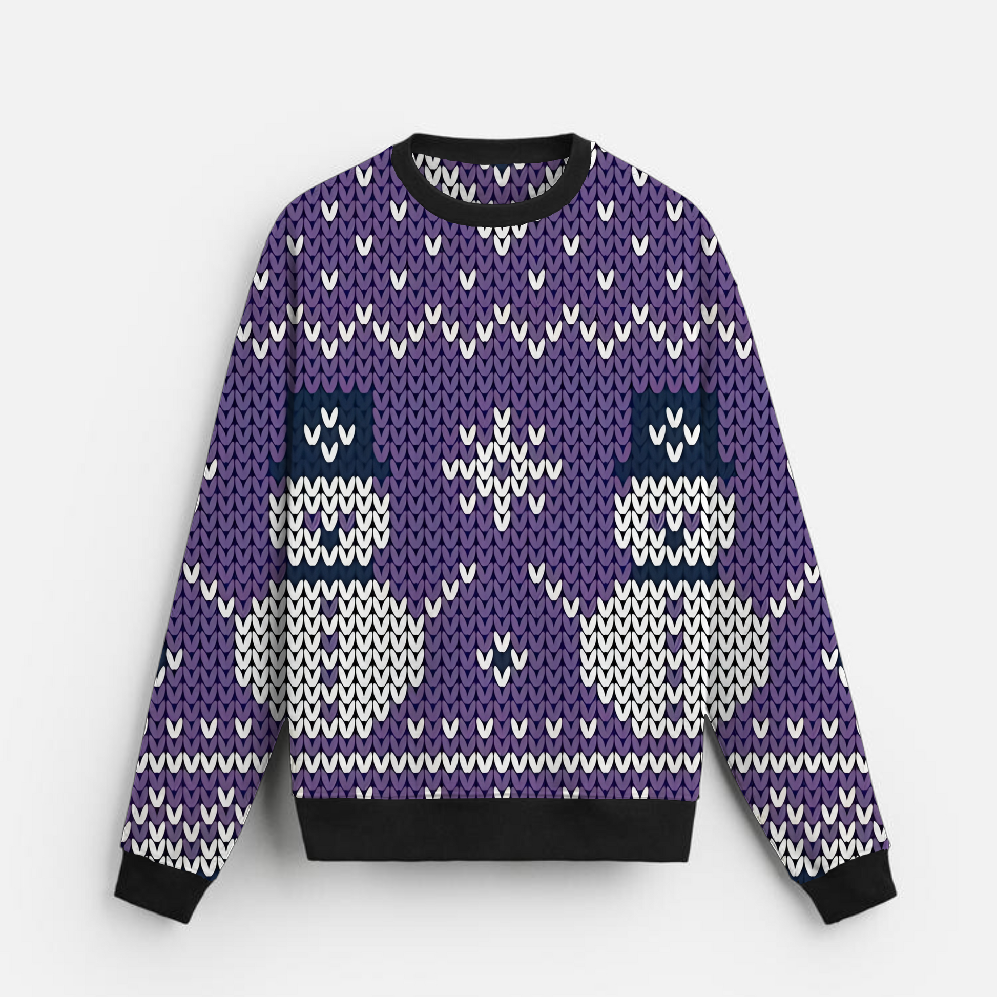 Cute snowman figures appear against a rich purple knit-style backdrop, creating a cheerful winter graphic with lighthearted seasonal appeal. The playful motif and unconventional base color bring festive character while maintaining approachability for casual holiday wear and everyday winter styling. (Note: the knit texture is a printed design, not an actual knitted fabric.)